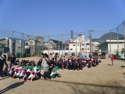 今回は、三軒家西幼稚園の園児たちも合同で行いました。5年生が、列の間に入り、年少さんの手をしっかりと握って歩いてくれました。交通安全に気を付けて、全員無事に移動できました。