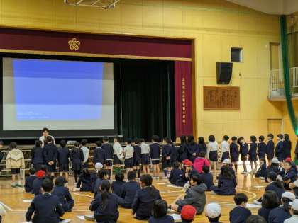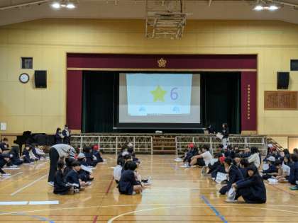 2月27日(木)、朝の児童集会時に、1年生から5年生は「卒業生を祝う会」のリハーサルをしました。