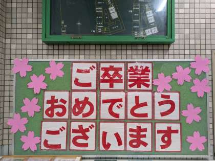 3月17日(月)、明日は第109回卒業式です。卒業生に向けて素敵な掲示が皆さんをお迎えしています。