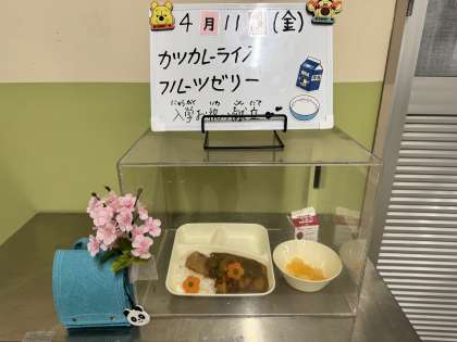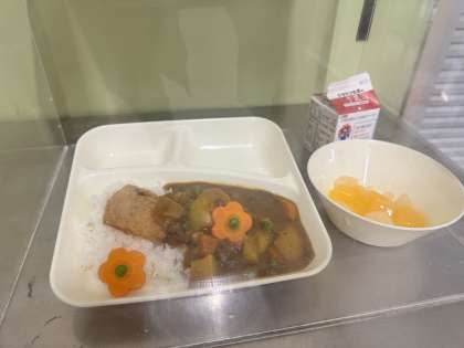 今日は入学お祝い献立ということでカツカレーとフルーツゼリーでした。