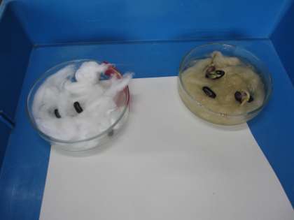「発芽の条件に水が必要かどうか」の実験をしています。