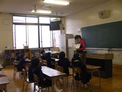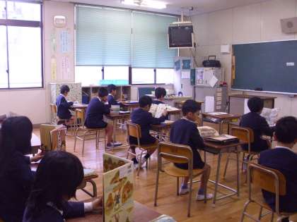 1年生は担任の先生による絵本の読み聞かせ、2年生はボランティアさんによる絵本の読み聞かせ、3年生以上の学年は自分が選んだ本を読んでいました。