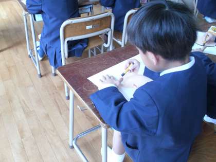 最初に、画用紙に大きく顔の輪郭を塗り、耳をつけ、髪の毛を描いていきました。子どもたちは、自分の髪の毛を触って、どのように生えているかを確かめながら描いていました。