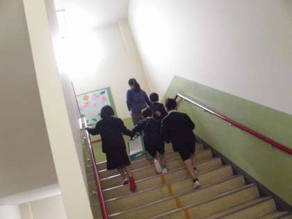 1年生は、2年生のお姉さん、お兄さんに連れられ3階まで行きました。図書室を覗いたり、6年生の学習風景を見たり。