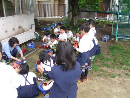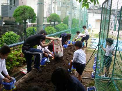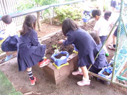 一人ひとりがプランターに土を入れ、やさしく苗を植えていきました。