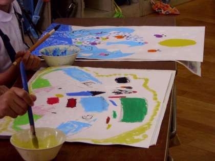 一人ひとりが思い思いに動物や植物、星や乗り物、いろいろな正体が明らかになってきました。仕上げは、絵の具で背景を丁寧に塗っていました!!