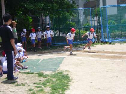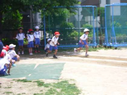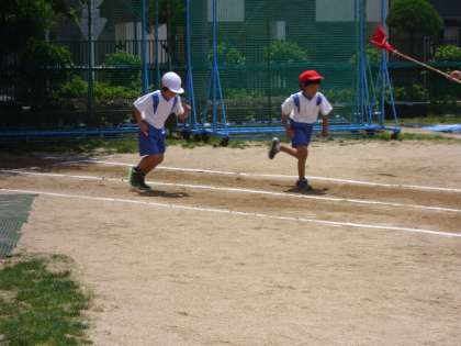 1年生には、50メートルはかなり長い距離です。でも、最初に担任の先生が走ってくれて盛り上がり、先に2年生が走ってくれたので、みんな最後まで走りきっていました!!