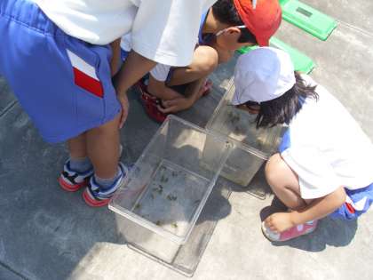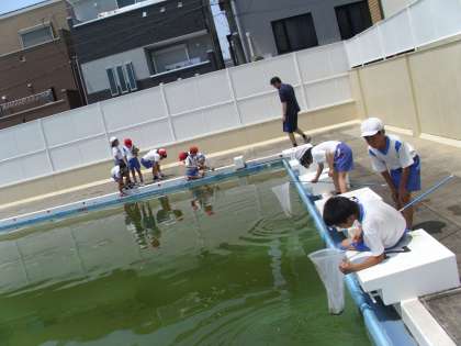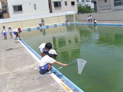 子どもたちは、プールの底に潜むヤゴを探して網ですくいます。藻のような水草のたまったているところにいるようです。