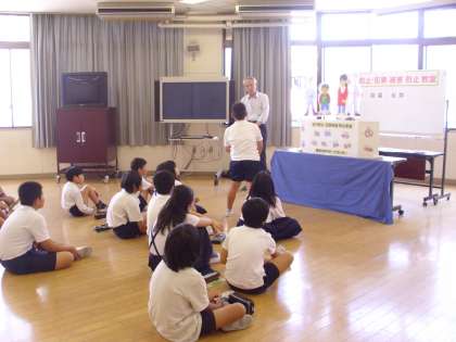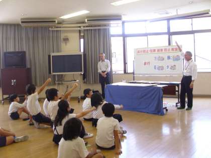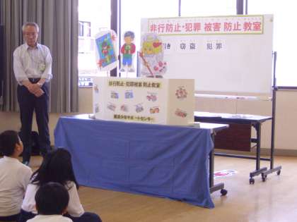 最初に、講師の先生とルールを決めてジャンケンをし、ルールの大切さを学びました。 続いて、人形劇で「万引きは非行の入り口」と教えていただきました。途中、3つの質問に子どもたちは、積極的に答えていました。また、万引きや悪いことに誘われたとき、断わる勇気・家の人の気持ちを思いやる心の大切さを学びました。