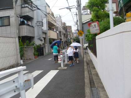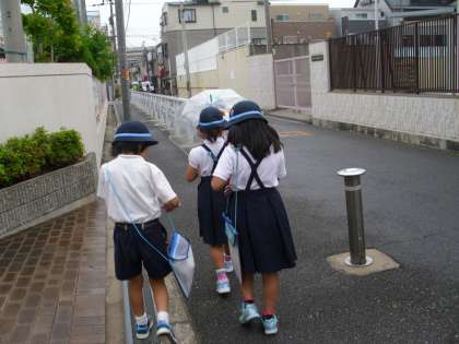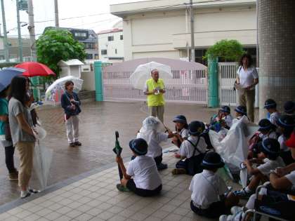 小雨が降り始めた玄関で、協力いただく、保護者や地域の方にあいさつして、6つの反に分かれて出発しました。