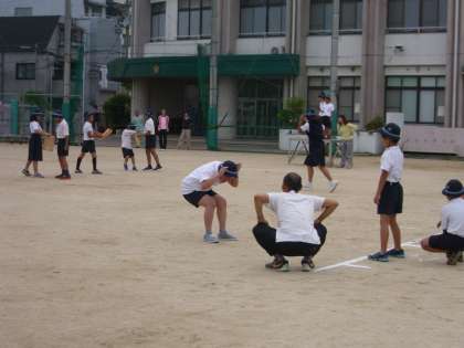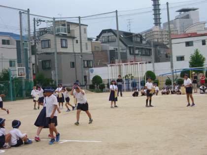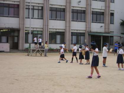 12の縦割り班が運動場の両側に分かれ、向かい合う2つの班が1チームです。真ん中に立った集会委員の持つ袋には、「うさぎ」「象」「モデル歩き」など歩き方を指示した紙(おみくじ)が入っています。子どもたちはおみくじを引き、その歩き方で反対側まで行って、リレーします。