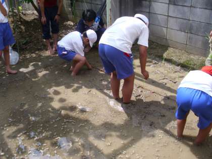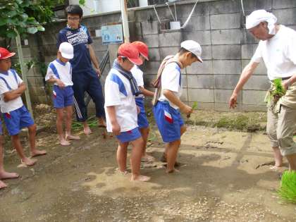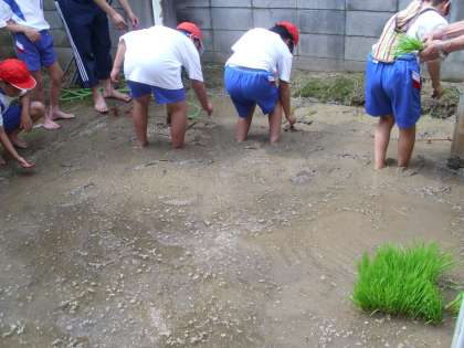 田んぼは体育館の北側、ビオトープの横にあります。子どもたちは、田おこし、代かきを経て、今日の田植えまでこぎつけました。