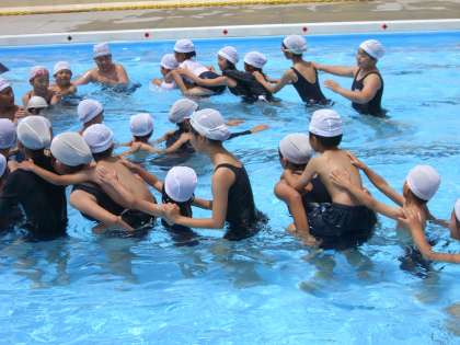 次は、1年生と6年生です。小学校の大きなプールが初めての1年生は、深いのが不安なようで(立つと水面が胸くらい)、6年生の背中におんぶしてもらったり、抱っこしてもらったり。6年生も、いとおしそうに優しく助けてあげていました。じゃんけん列車も楽しそう!これで、1年生も、プールなんて怖くないね!!