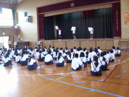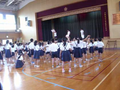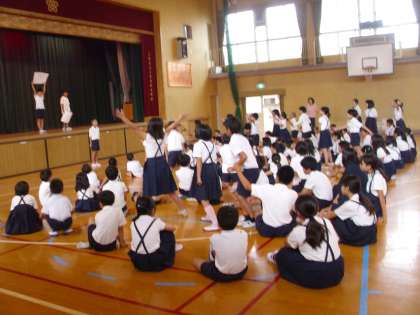 舞台に立った集会委員が出すボードをに対して、子どもたちが体で大きく「グー」「チョキ」「パー」を表現して勝負します。