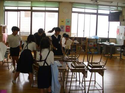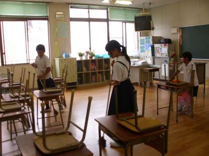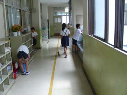 本校では、昼休みに掃除の時間を設定し、縦割り班で清掃活動を行っています。各教室も縦割り、廊下も縦割り。