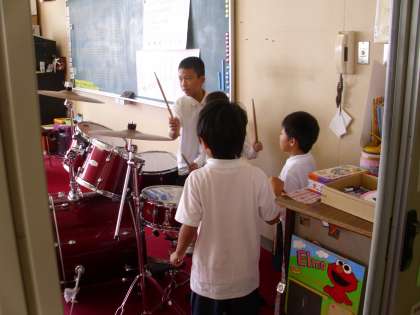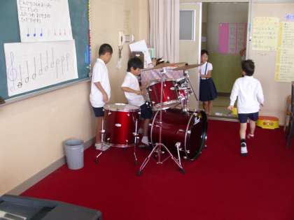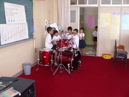 本校では、音楽室にドラムセットが設置してあり、先生の許可があれば、休み時間や昼休みに練習ができます。