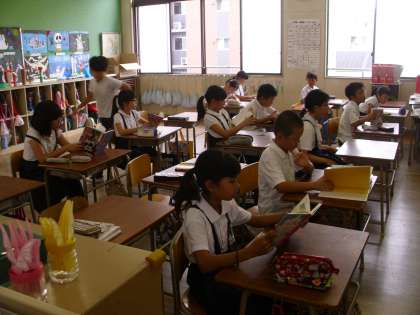 本校では、「読書好きのこども」を育てるため、読書活動に取り組んでいます。毎週水曜日に読書タイムを設け、自分の好きな本を読んだり、低学年には、図書委員や地域ボランティアによる絵本や紙芝居の読み聞かせを行っています。