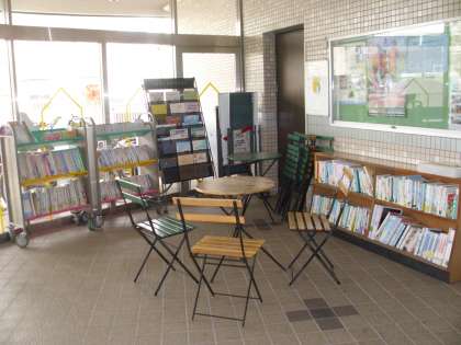 学校の玄関横にも読書コーナーを設け、いつでも、読書できる環境づくりを行っています。