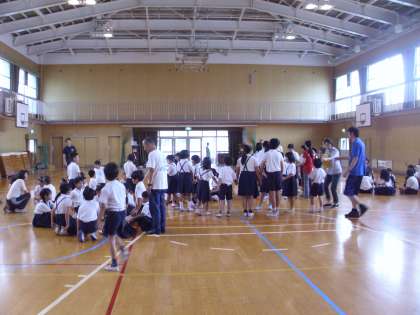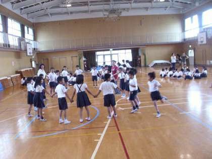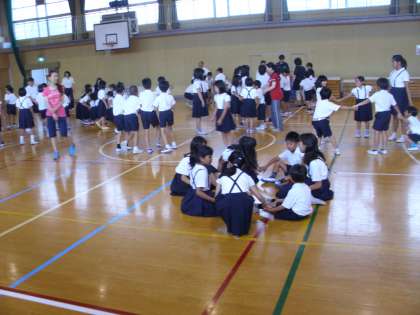 6月23日(木)、今日の児童集会は、「タンバリンゲーム」をしました。このゲームは、集会委員がタンバリンを鳴らす数の人数が集まり、手をつないで座るゲームです。