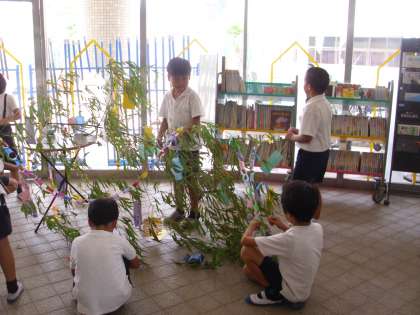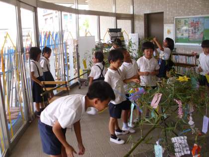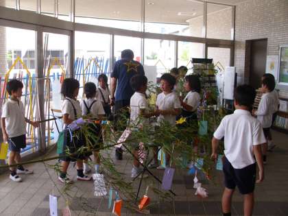 3年生も短冊に願い事を書いて、持ってきました。2本の笹が子どもたちの願い事でいっぱいになってきました。明日の七夕には、玄関前に飾りつけをします。