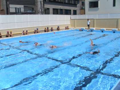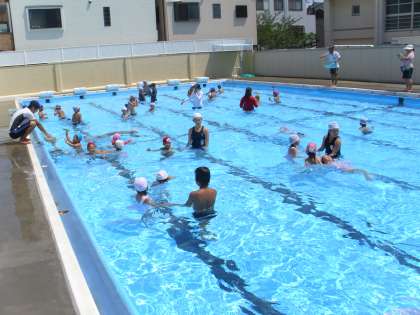 三西幼稚園の園児たちは、怖がることなく5年生の誘導で大きなプールに入りました。5年生はいつものようにプールの中でウォーミングアップのダンスを披露しました。
