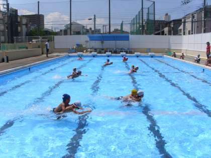 続いて、5年生が得意の泳ぎを披露したり、園児を肩を持たせたりおんぶして競争しました。