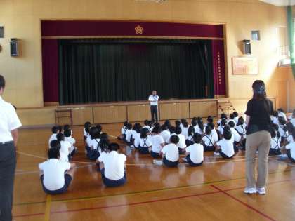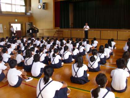 最初に校長先生から、1学期の間に一人ひとりがしっかり成長したこと、夏休みも目標をもって「日々成長、毎日が新記録!!」を続けることのお話がありました。