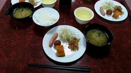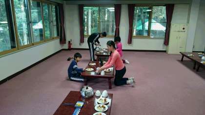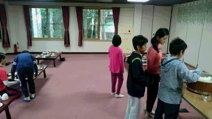 食事係の子どもたちは、一足早く食堂に集まって、みんなの食事の準備をします。昨日の夕食に続いて2回目ということで、手際よく準備できるようになりました!