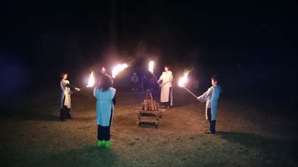 日は沈み、夜は鉢伏山をつつみました。さあ、キャンプファイアーの始まりです!一年前、みなさんの先輩が友情の火を燃やし、みなさんのために鉢伏山に静かに返してくれました。その友情の火を、今宵、再び明々と燃やしましょう!