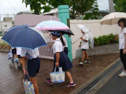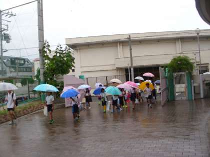 子どもたちは、傘をさし、たくさんの提出物を持って集団登校してきました。みんな、一回り、大きくなったような気がします。みんな、日々成長、たくましくなりましたね!!