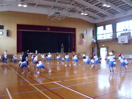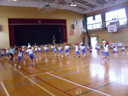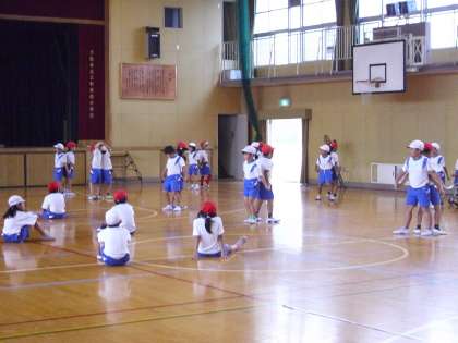 今日は、低学年が体育館で団体演技の練習をしていました。今週の火曜日から練習が始まったばかりですが、みんな振付をしっかり覚え、楽しそうに練習していました。
