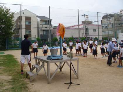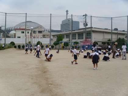 体育委員がやり方を説明し、子どもたちは赤白に分かれて小石を拾いはじめました。残り時間が、あと1分になったとき、保健室の体重計が朝礼台の上に乗せられました。