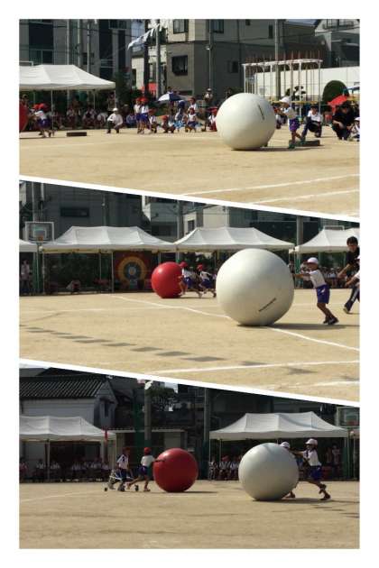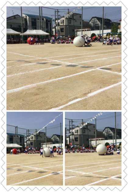 1・2年生の「大玉ころころ」です!自分の身体より大きい玉を転がします!!