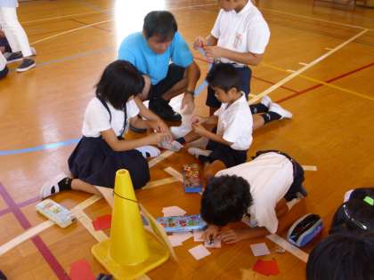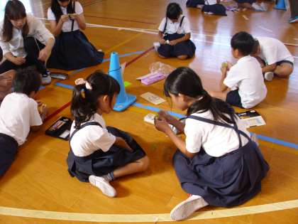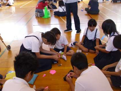 低学年の児童には、「折鶴」は難しいので、高学年の児童が優しく折り方を教えていました。