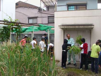 子どもたちは、服を着替え、鎌の使い方を教えていただき、3人ずつ田んぼに入りました。最初は、力の入れ方がわからず、苦労していましたが、だんだんコツをつかみ、サッと刈れるようになりました!!