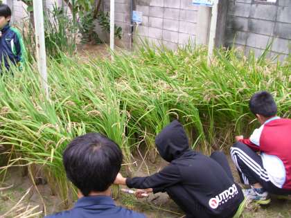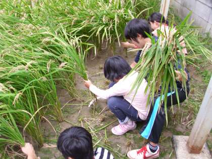 10月11日(火)、5年生が育てた稲がたわわに育ち、今日、稲刈りをしました。