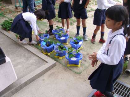 子どもたちは、丁寧に自分の一株をプランターに植えていきました。土を押えすぎず、ふんわりと入れ、まだ秋だというのに、「早く春にならないかな」と<春が待ち遠しいようでした!!