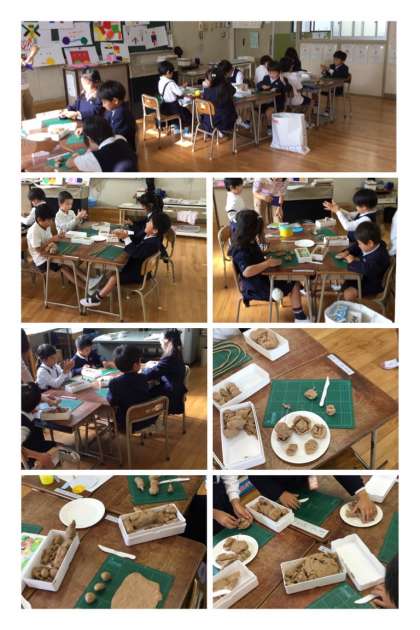 11月1日(火)、1年生の図工の学習の様子です。粘土でごちそうをいっぱい作っていました。ケーキにパスタにピッツァ、たこ焼きもフランクフルトもできました。