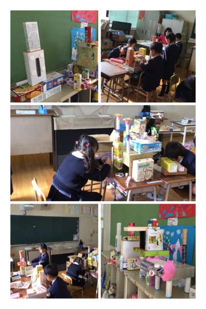 いろんな箱を使って、自分の好きな何かを作っているそうです。建物や乗り物、動物園など、いろんなものができました!!