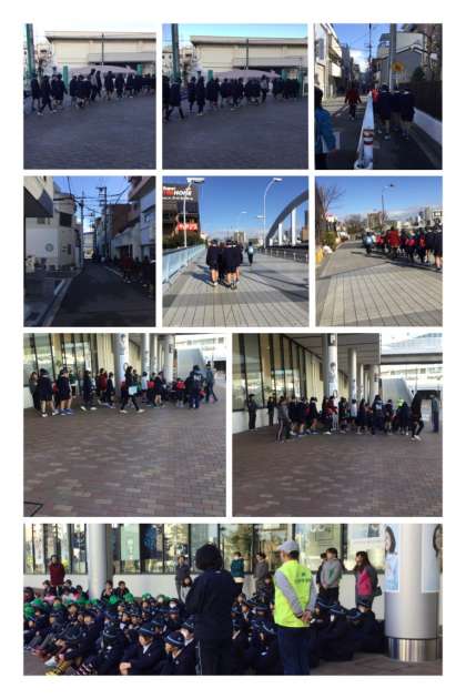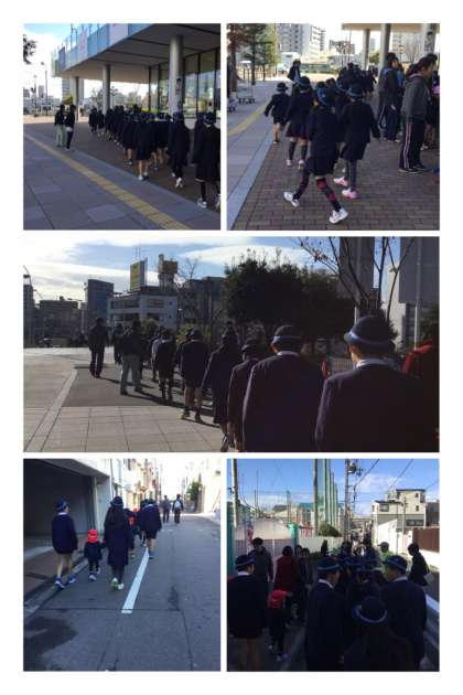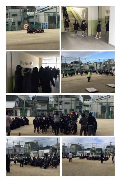 大きな地震が起こったという想定で運動場に集まり、大津波から避難するために京セラドームに向かいました。5年生は年少組の園児と手をつなぎ、世話をしながら歩きました。