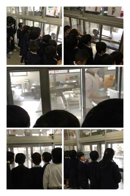 1月23日(月)、今日から給食週間です!1年生から3年生の子どもたちが給食作りの見学をしました。大きな釜やしゃもじを見て驚いたり、給食用の全卵が入ったパックを見て何かなと首を傾げていました!!