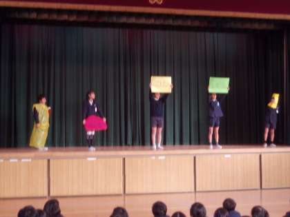 今朝は、給食集会を開き、給食委員会の子どもたちが劇を披露しました。笑いをまじえた熱演で、「バランスのよい食事をしよう。」とみんなにうったえかけることができました。