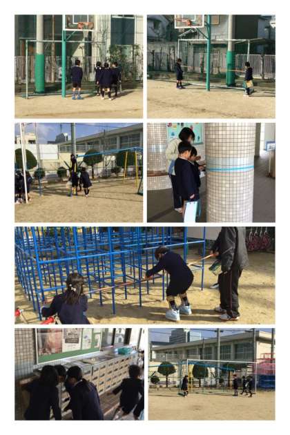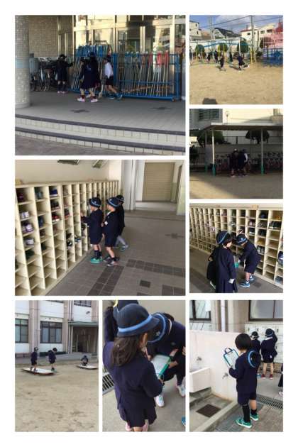 1年生は、運動場を走り回って、遊具や鉄棒、下足ロッカーを指差していました。