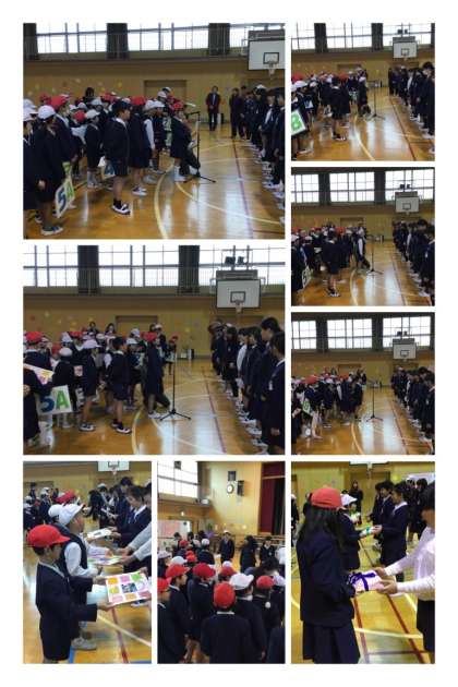 1〜5年生の代表がお礼の言葉と色紙が6年生が贈られ、6年生からもお礼のプレゼントとして、劇が披露されました。小学校の生活を綴った劇で、ユーモアを交じえみんな大喜びでした!!