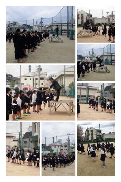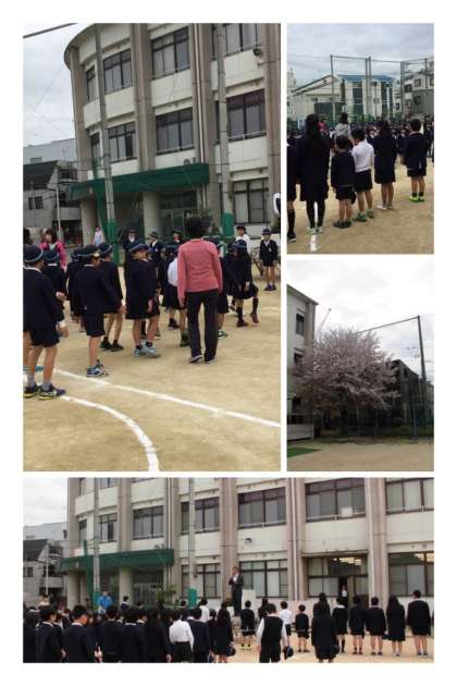 4月17日(月)、毎週月曜日の朝には児童朝会を行なっていますが、今日は、1年生にとっては初めての児童朝会です。並び方から礼の仕方、教室への戻り方を練習しました。
