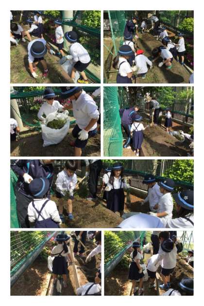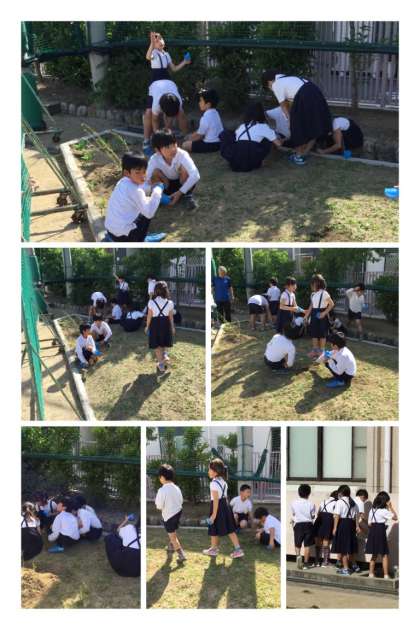 2年生は、学習園の草むしりをしてサツマイモの栽培の準備とチューリップのプランターを片付けプチトマトを植える準備をしていました。