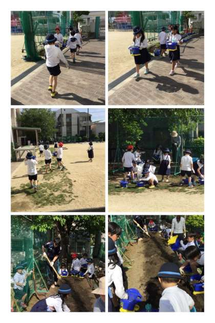 5月2日(火)、初夏のように気温が上がった午後、2年生と3年生が学習園で土作りをしていました。