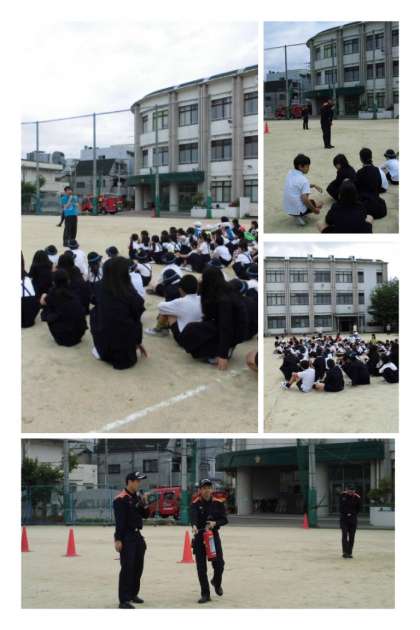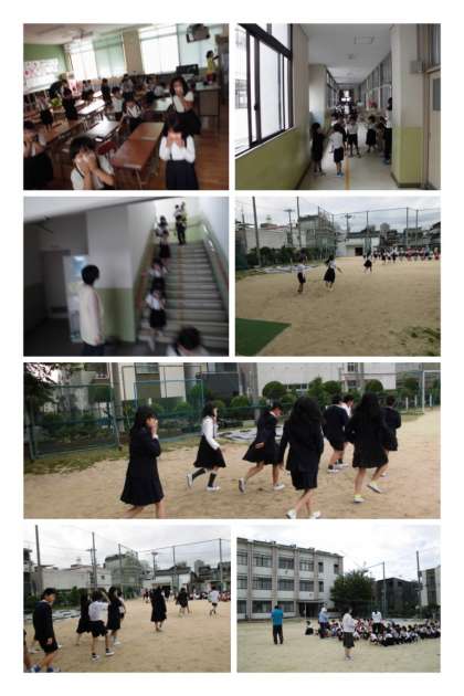 管理作業員室から出火した設定で放送が流れると、子どもたちは、ハンカチで鼻と口を押さえ避難の準備を始めました。南側階段を使って1階まで降り、運動場に出たら駆け足で避難しました。
