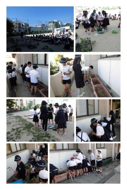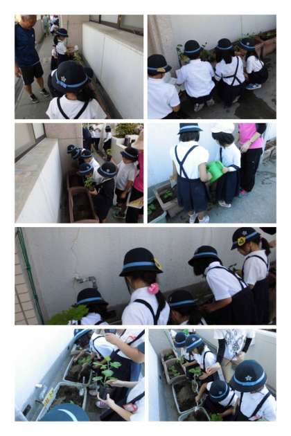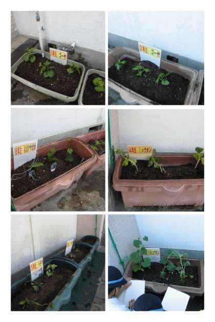 5月19日(金)、朝から全学年で緑のカーテンの植えつけをしました。各学年で、ヘチマ・ひょうたん・ゴーヤ・琉球朝顔の苗をプランターに植えました。