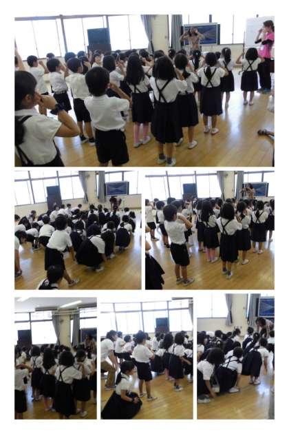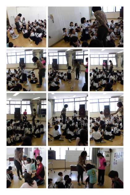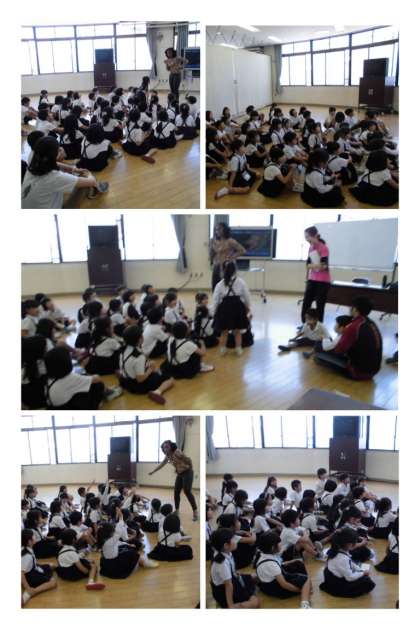 今日は低学年の第一回目で、1・2年生は、合同でC-NETのカレン先生と一緒に英語で遊びました。子どもたちははじめは緊張気味でしたが、すぐにカレン先生と仲良しになり、楽しく英語で遊ぶことができました!!